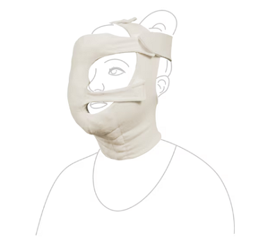 A Face Mask €“ Half is a foam-filled garment that covers the cheek, eye and forehead on either the right or left side of the face (specify side when ordering). This garment is stitched with continuous flow channeling to promote optimal lymph drainage.