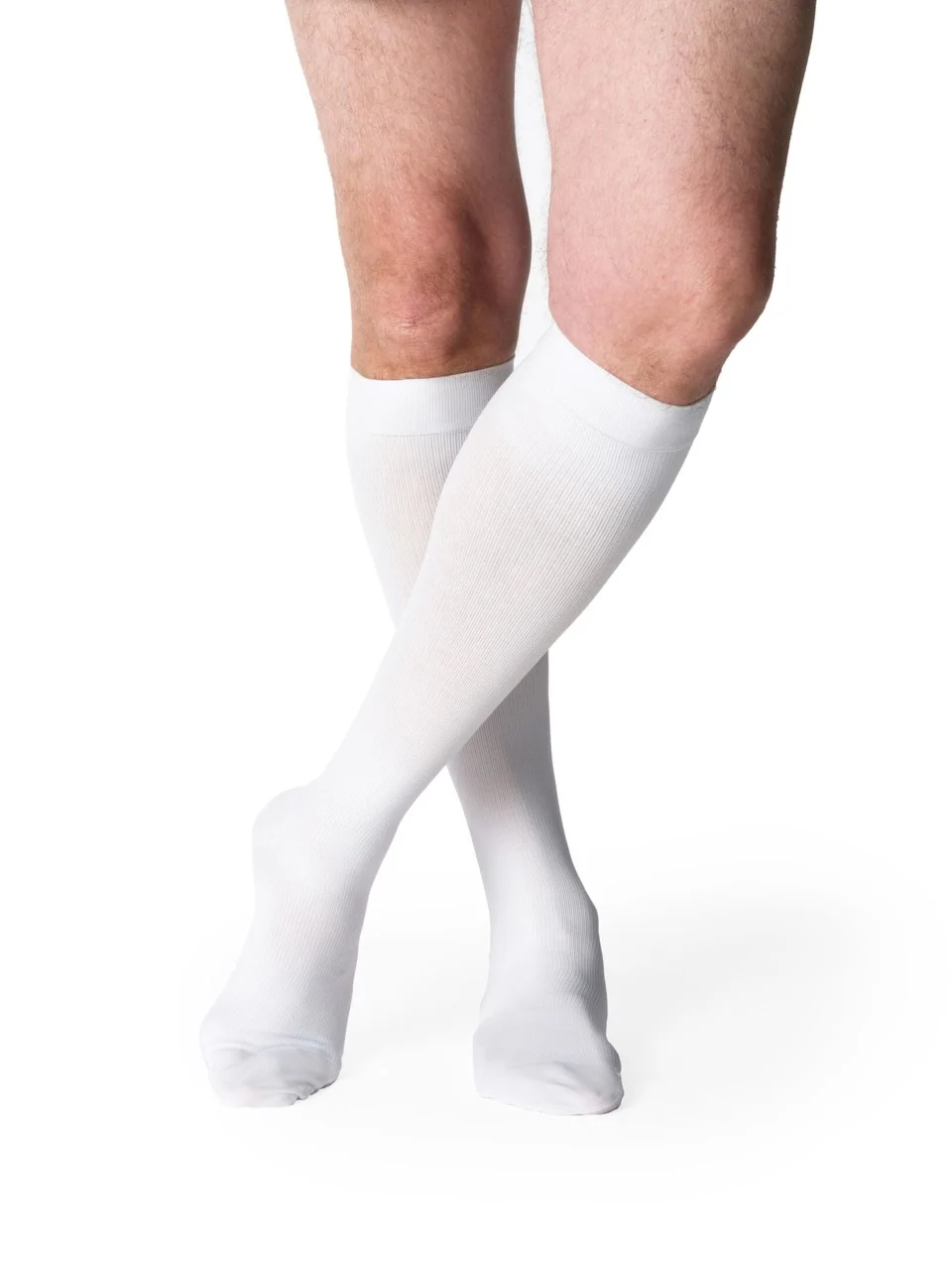 Sigvaris Essential Cotton Calf for men combines all-day cotton comfort and a classic ribbed design that is ideal for sensitive skin.