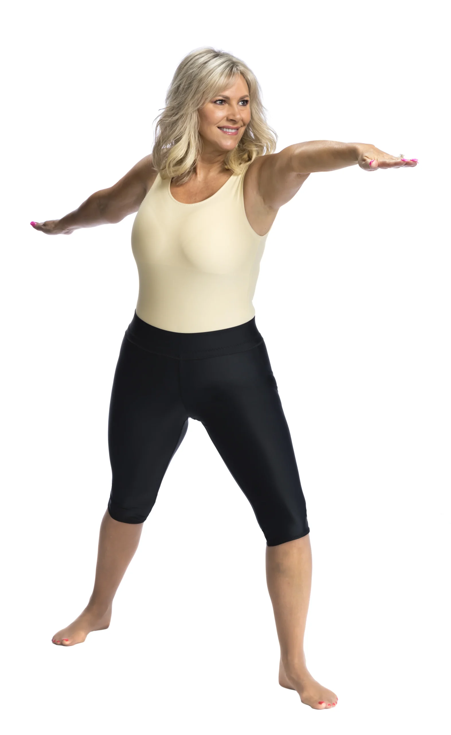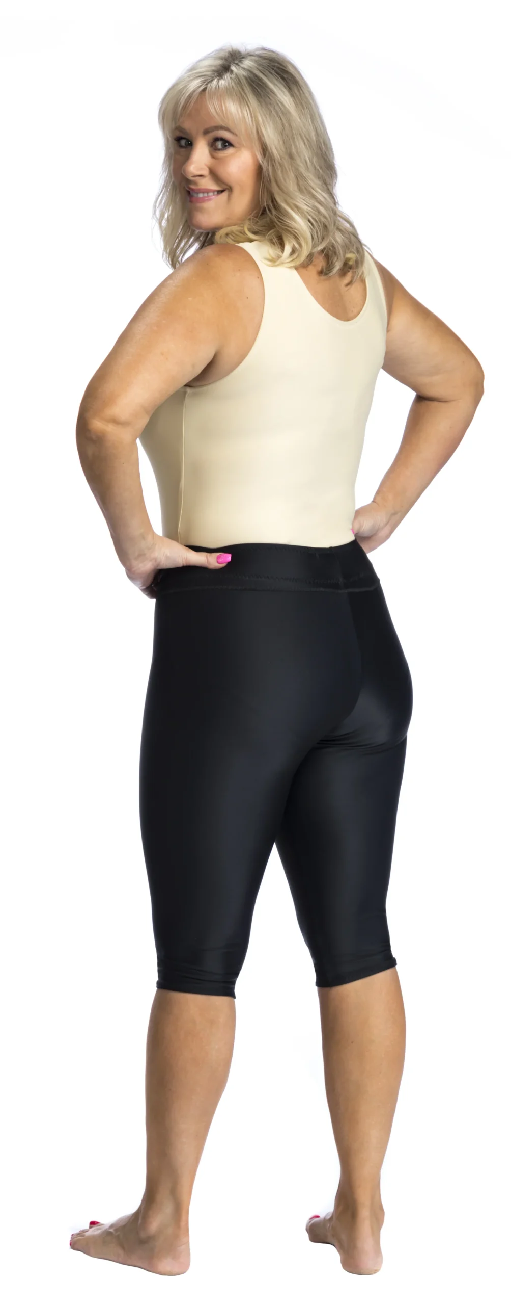Includes compression to cover the waist, abdomen, lower back, hips, buttocks, thighs and calves. These Shorter Capris fit exactly like the Wear Ease Compression Capris, but are 6 inches shorter with a softer waistband. Wear these short capris every day and during physical activity – they’re comfortable and flattering and provide just the right amount of support for long term wear, containment and compliance. For best results, do not wear underwear. May also be worn for swimming.